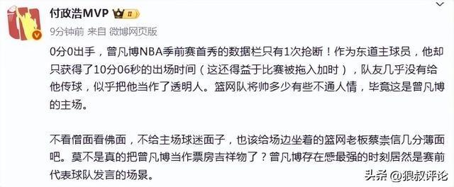 媒体人付政浩曾经在首战发文点评:0分0出手,曾凡博NBA季前赛首秀的数据栏只有1次抢断!作为东道主球员,他却只获得了10分06秒的出场时间(这还得益于比赛被拖入加时),队友几乎没有给他传球,似乎把他当作了透明人。篮网队将帅多少有些不通人情,毕竟这是曾凡博的主场。